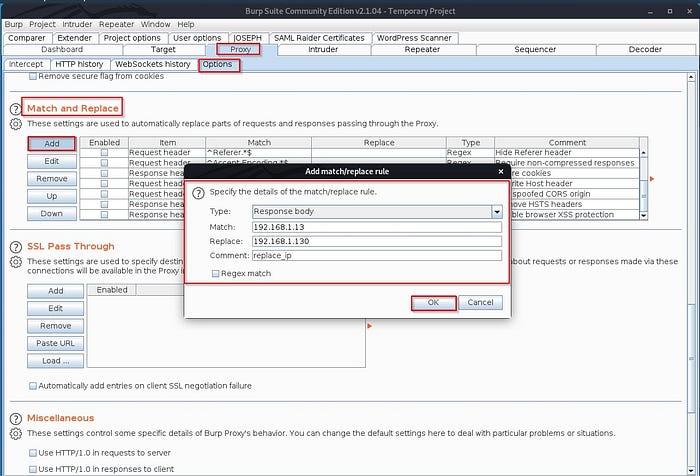 Considering this I used one feature from burp called “Match and Replace”. Using this I replaced the IP address in response body with the target host IP we have discovered at the start.